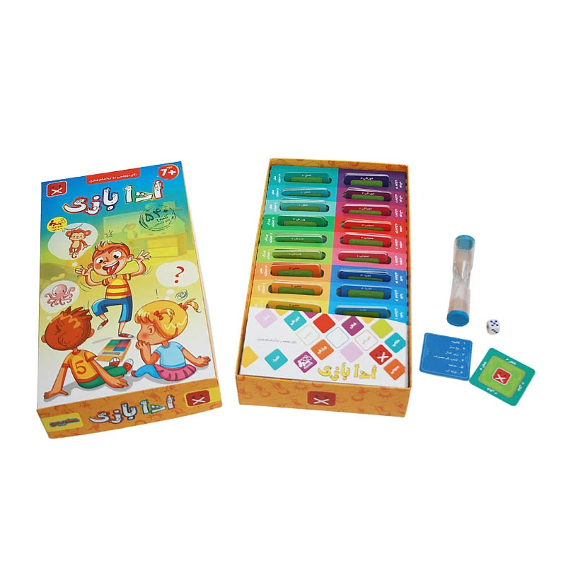 به زبان ساده، ادابازی یعنی نمایش کلمات و عبارات بدون استفاده از صدا یا کلمات! بازیکنان با حرکات بدن، ژستها و میمیک های خلاقانه، سعی میکنند تا کلمات روی کارتها را به همتیمیهایشان برسانند. این بازی گروهی شامل کارت رنگی با کلمات متنوع (از کلمات روزمره تا ضربالمثلها و عبارات خندهدار)، یک ساعت شنی هیجانانگیز برای محدودیت زمان، ۶ سربند رنگی برای تیمها، ژتون امتیازدهی و یک تاس رنگی است. جعبه بازی با طراحی کارتونی و شاد، شامل تصاویر کودکان و حیوانات بامزه، آن را به یک اسباب بازی دخترانه و پسرانه تبدیل کرده که همه سنین را مجذوب خود میکند.