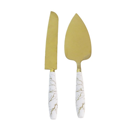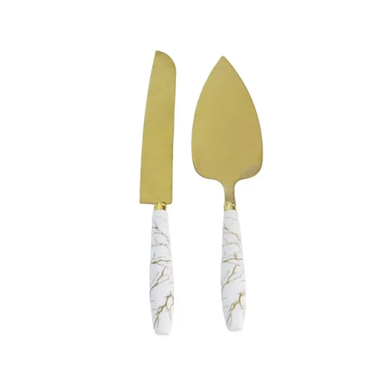 ست کارد و کفگیر طلایی کیک با طراحی لوکس، تیغههای استیل ضد زنگ و دستههای ماربل، انتخابی شیک برای برش و سرو انواع کیک است. این کارد و کفگیر برش کیک در عین زیبایی، دوام و کیفیت بالایی دارد.